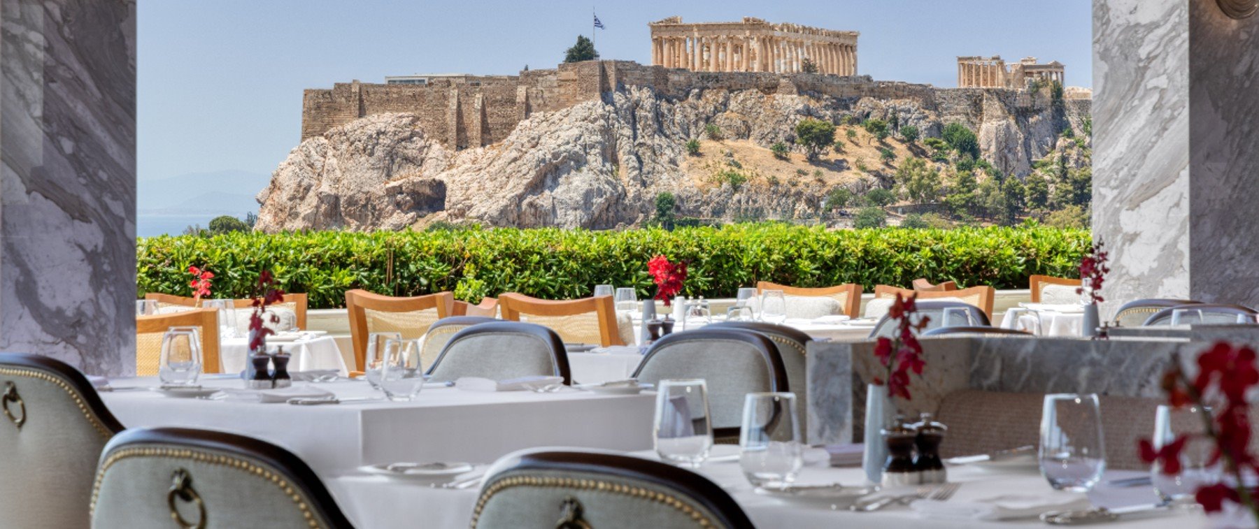 The Acropolis and the Parthenon as well as Lycabettus hill and the Doric Greek Parliament at Syntagma Square, are located just one breath away and can be admired from every corner, giving a touch of unparalleled glamor to the classy GB Roof Garden Restaurant and Bar.