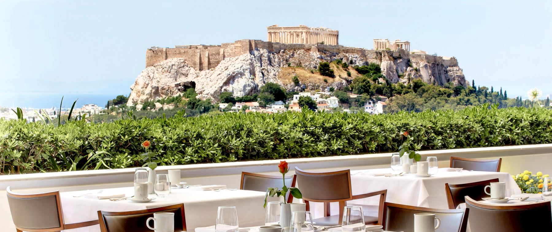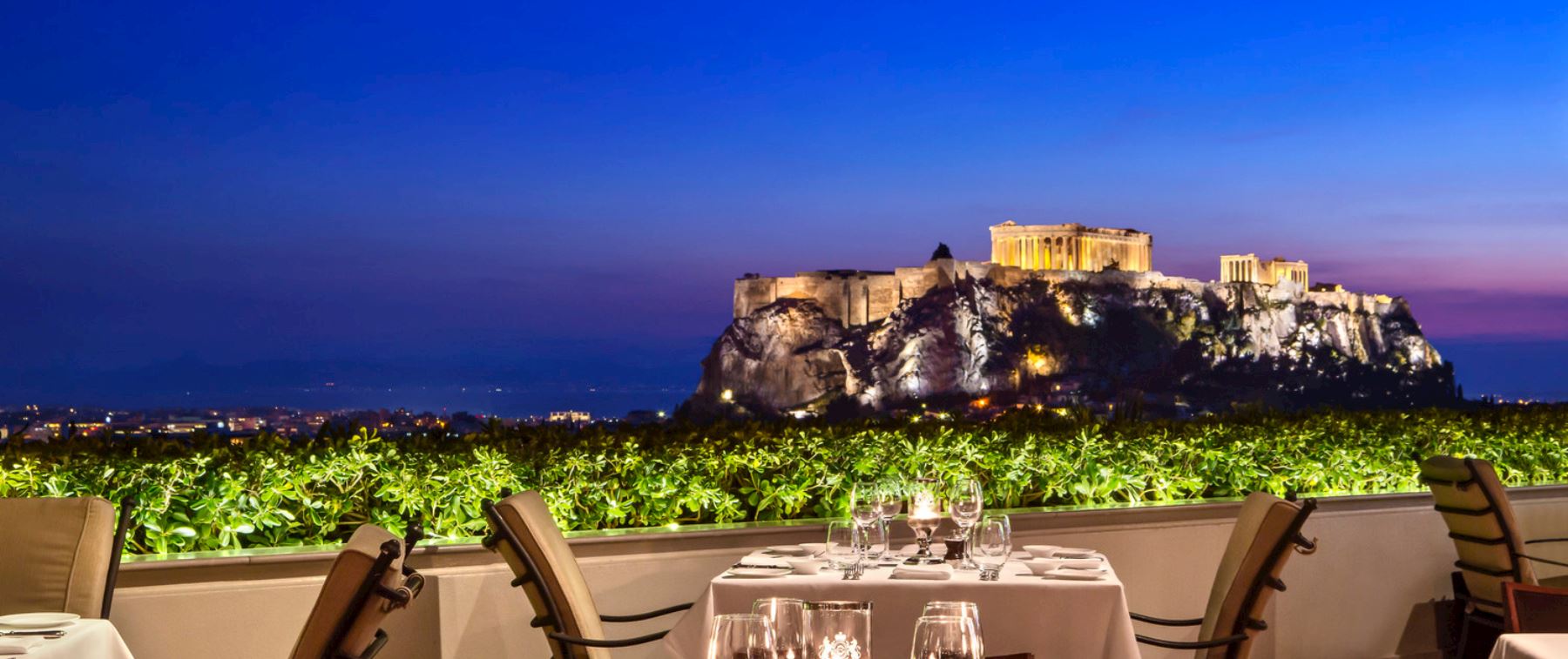Before a romantic dinner or for a night out, enjoy an aperitivo and experience the enchanting atmosphere from the roof of the Hotel Grande Bretagne.